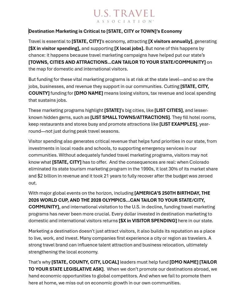 Example opinion piece framework to help destinations advocate publicly for travel investment and awareness.
